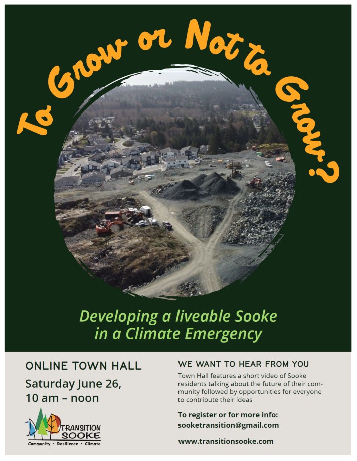 Transition Sooke is holding an online town hall on Saturday, June 26, from 10 A.M. to noon. To register or for more information email sooketransition@gmail.com.